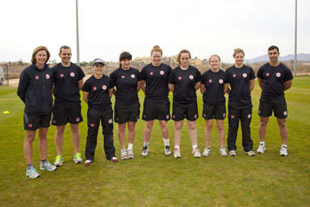 Lisa Keightley, (far left) MCC Team Manager, Jonathan Finch, Head Performance Coach (2nd Left) and Christian Vassallo, Strength and Conditioning Coach (far right), with MCC Women’s Young Cricketers players: Sophie Luff, Alex MacDonald, Hollie Armitage, Jessica Watson, Georgina Holmes, Georgina Hennssy, Stephanie Butler and Carla Rudd.