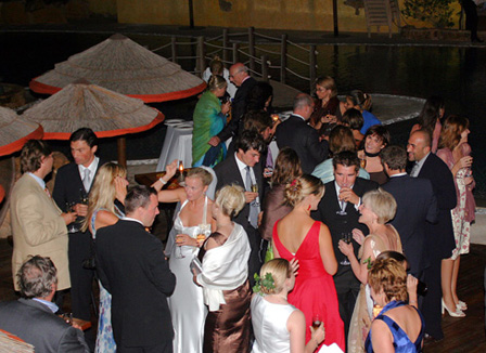 | Pictured at the Crocodile Club, the bride and groom enjoy poolside drinks with their guests in the warm evening air. |