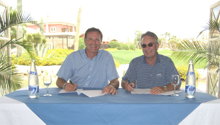 From Right to Left: – Chairman of CGTV Games Ltd., David Mathewson & Desert Springs Director of Golf & Marketing Simon Coaker, at the signing ceremony at the Desert Springs Resort of the Presenting Sponsor agreement for the Sir Ian Botham Charity Golf Classic.