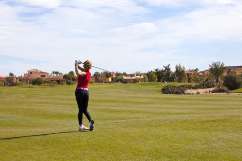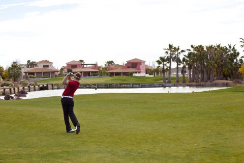 Una estudiante de Hartpury College juega su golpe de approachen el hoyo 4 "Cinch" en el campo Indiana de Desert Springs, el único resort familiar de lujo con campo de golf desértico en Europa galardonado internacionalmente en la región del Almanzora, Almería.