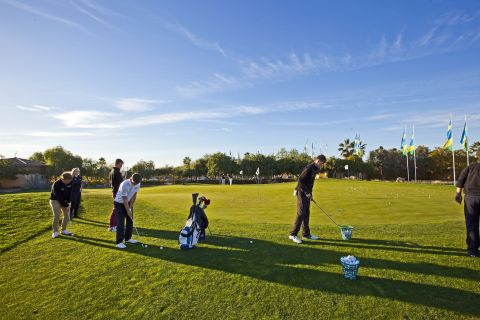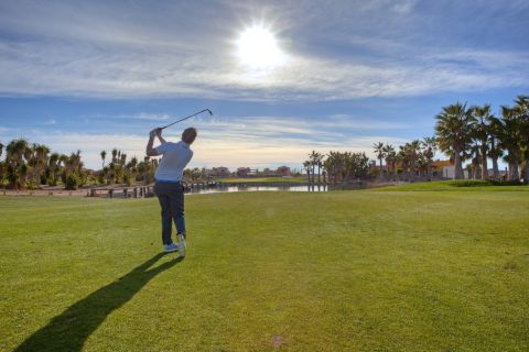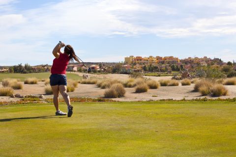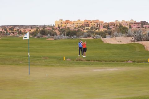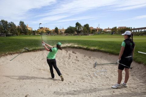 A student plays their approach shot into Hole 18 “Last Chance” on the Indiana course at Desert Springs, Europe’s only international award-winning luxury family resort and championship desert golf course in the Almanzora region of Almeria in south-east Spain.