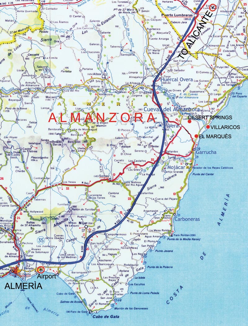 Almería International Airport is the fast growing local airport for the Almanzora and Desert Springs Resort. An easy 40 minute drive along the E15, a new and virtually empty section of the Autopista de la Mediterrania motorway, which skirts the the Cabo de Gata National Park and the majestic Cabrera Mountains, brings you to the Almanzora and to Desert Springs Resort.