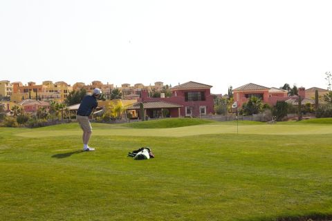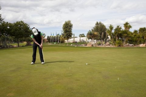 Un estudiante trabajando en su tiro en el Hoyo 15 “Abyss” en el campo Indiana en Desert Springs, el único resort familiar de lujo galardonado internacionalmente en Europa y campo de golf desértico en la Región del Almanzora en Almería en el sudeste de España