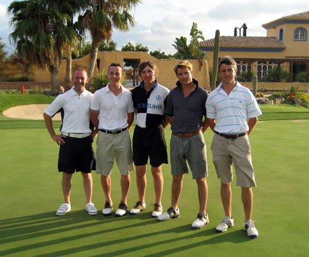 | Pictured is Cheltenham Gold Cup winning jockey Sam Thomas (second from right) with other ‘jump boys’ (left to right) Jody Mogford, Colin Bolger, Alan O’Keefe and Dominic Elsworth at Desert Springs during a special three-day break arranged for the Newbury-based Professional Jockeys Association (PJA) by The Almanzora Group Ltd of Cheltenham. |