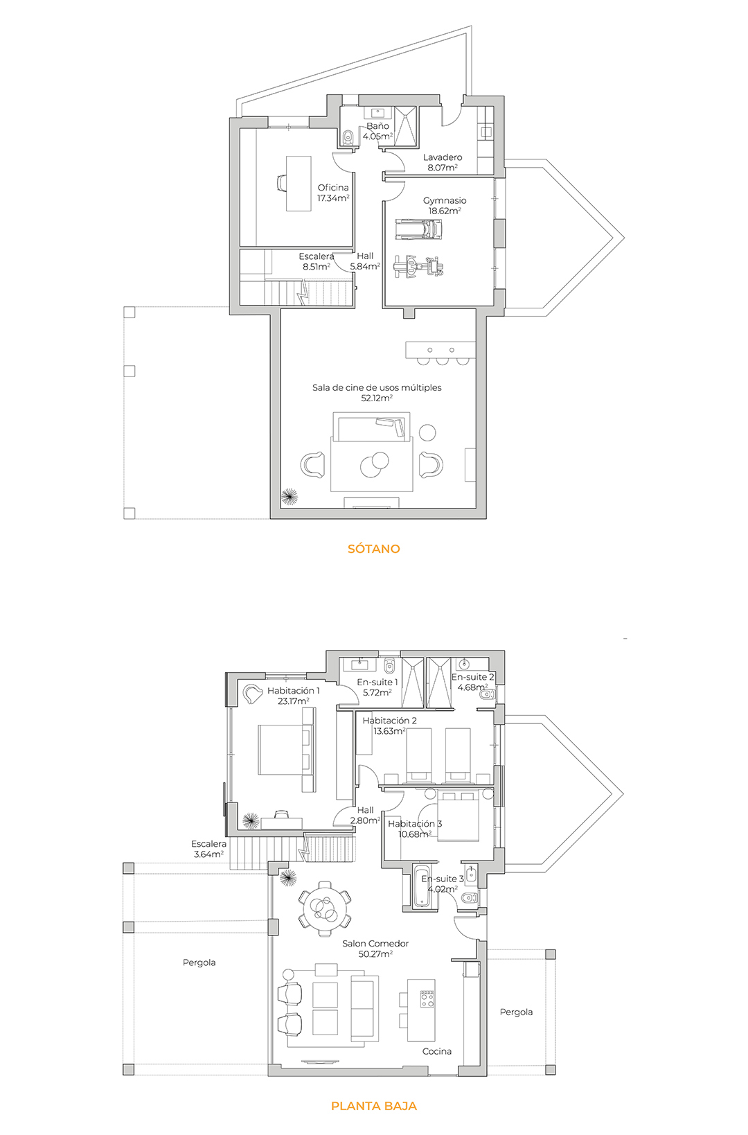 El dormitorio principal tiene acceso directo a la amplia terraza y a la piscina. Los tres dormitorios tienen su propio cuarto de baño en suite y la amplia planta baja cuenta con una sala de juegos, sala de cine, lavadero, oficina y cuarto baño.